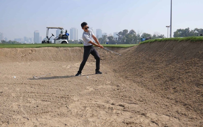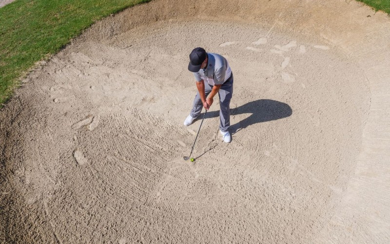A good bunker player will open the club and turn the loft down into the sand and come out leaning forwards.