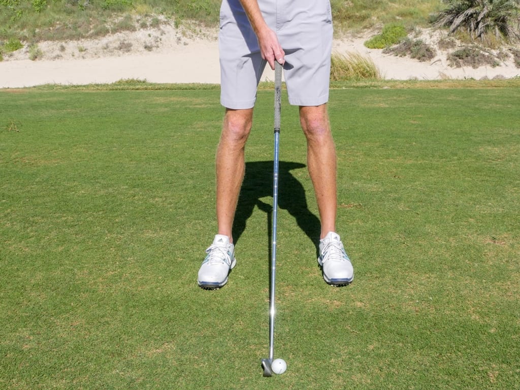 Step number four is to place your feet shoulder width apart if you have your legs too far apart this will limit the amount of turn that you can generate during the swing. Too close together and you will lose balance.