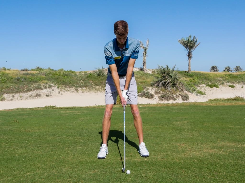 Step number five is to push your hips backwards. This will help you to create the spine angle needed in the set up this should be tilted around 45 degrees. If you lean forward without pushing your hips back it will cause you to have a curve in your spine. This can cause issues during the swing.