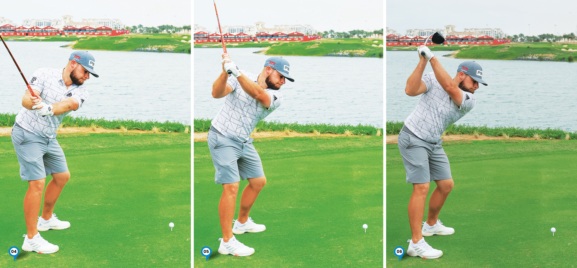 3. Tyrrell’s right arm starts to fold and his wrists softly set as the club works up on a perfect plane. Again his chest has continued to coil against a solid lower half with limited hip coil early in his pattern.