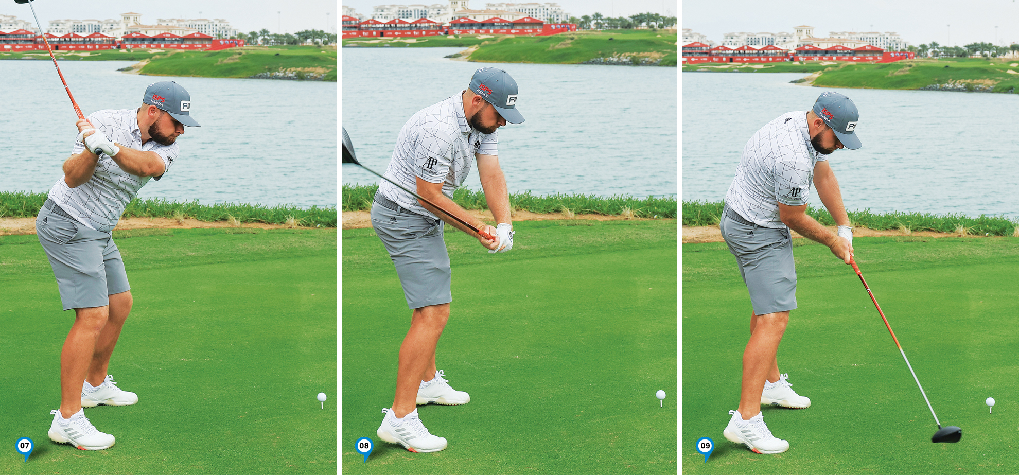 6. At the top the club reaches a point slightly short of parallel due to his controlled hip coil. This position although slightly shorter than some of the worlds best players I believe is Tyrrells superpower as it gives him way more in terms of consistency and club control than he could ever gain with a slightly longer swing. You’ll also notice his hips have started to shift and coil left indicating he’s already started his transition into the downswing.