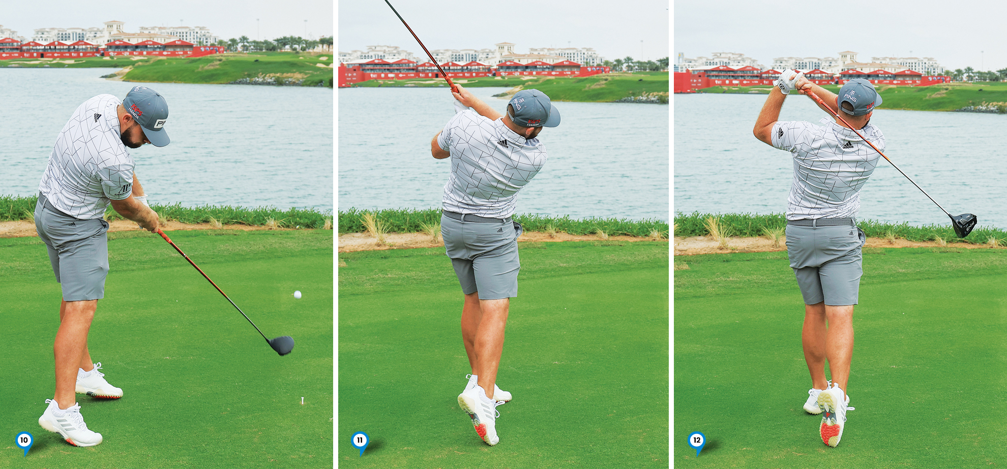 10. Full release of the club and full extension of his arms down the target line as he continues to push up of the ground. His head stays beautifully behind the ball guaranteeing a positive attack angle.